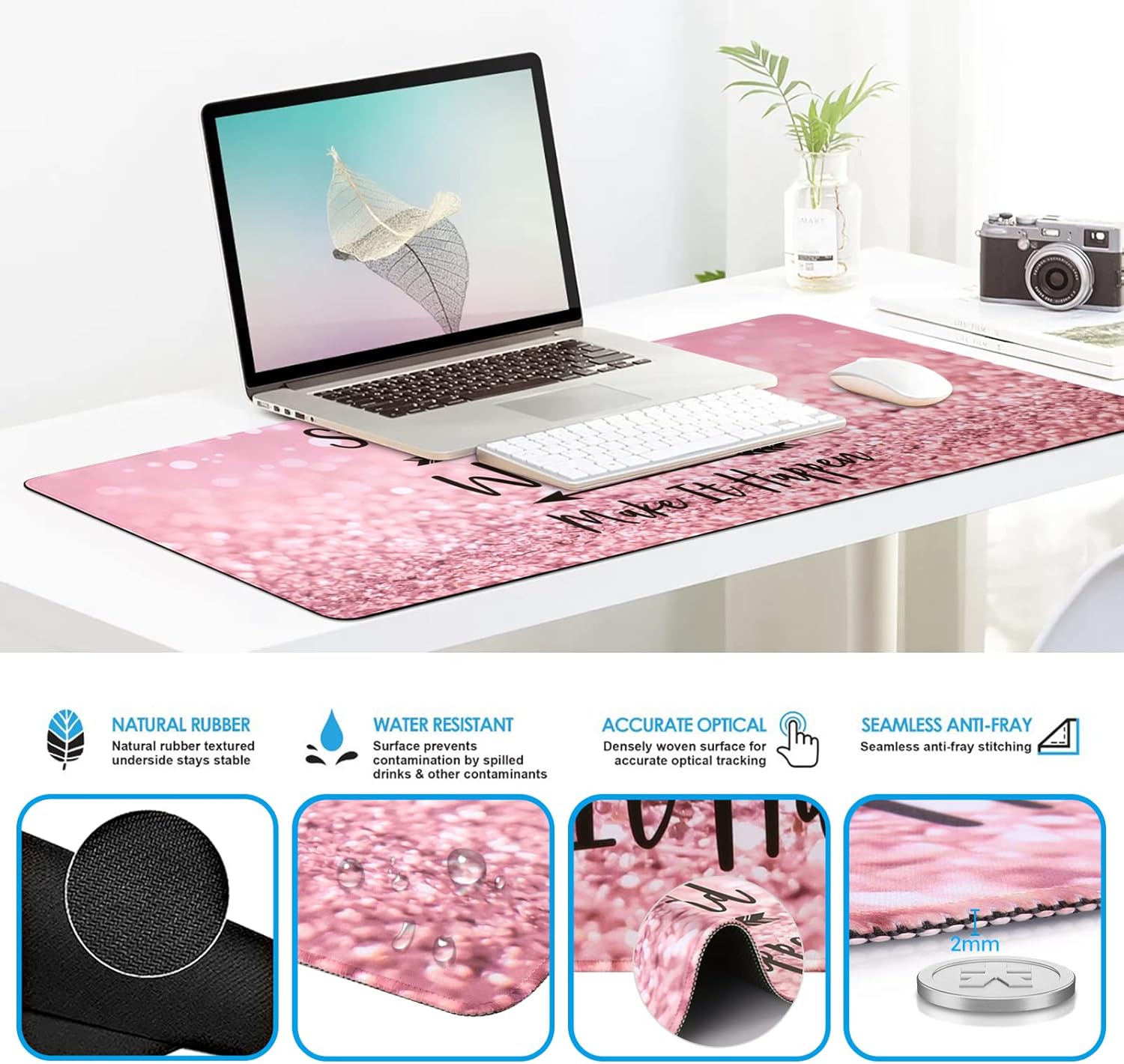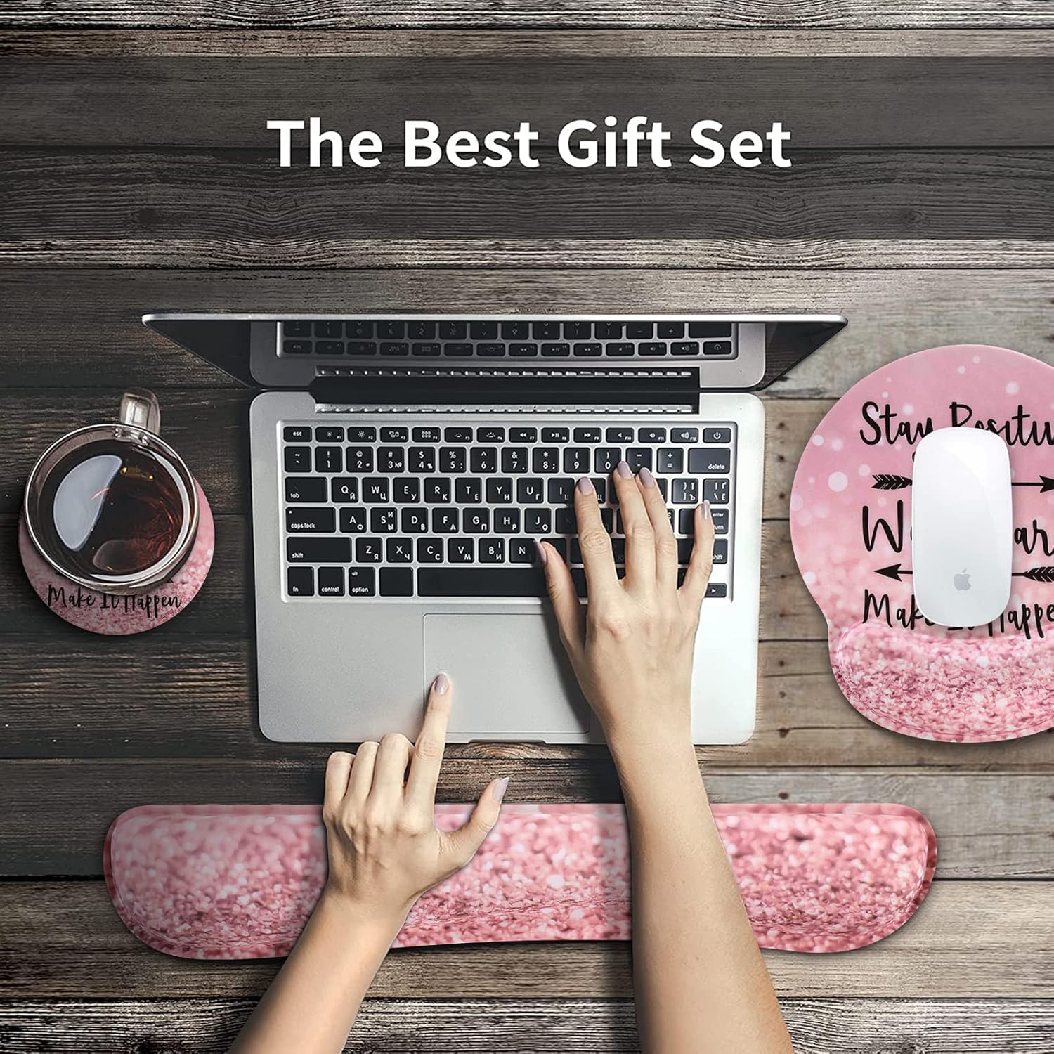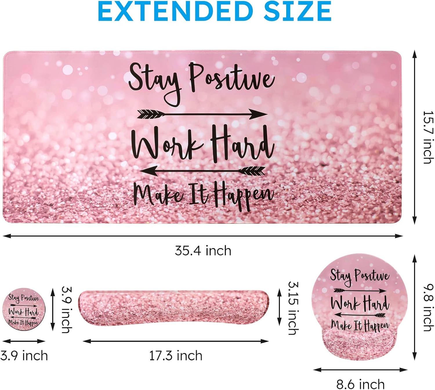 iCasso Mouse Pad,Large Pink Desk Mat Set, 4in1 XXL Mousepad + Keyboard Wrist Rest+Mouse Wrist Rest+Coaster with Ergonomic Desk Pad for Home Office Table Computer Cover -Pink Stay Positive